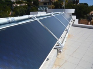 The tank primarily runs on solar thermal energy from 5 elevated solar panels that are installed on the flat roof.